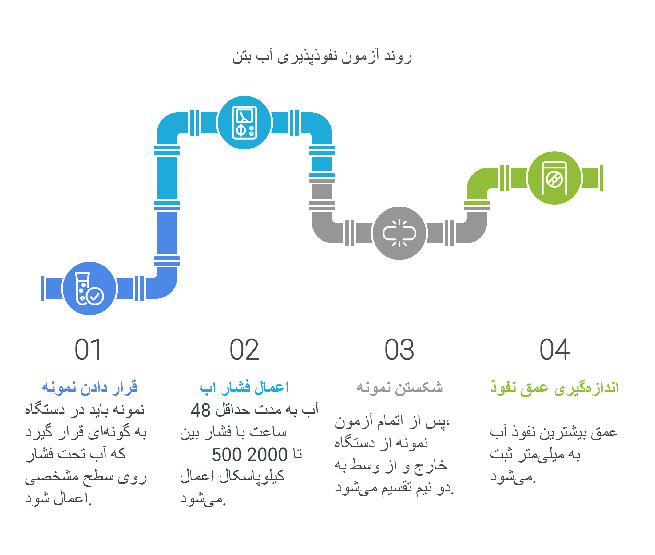 اعمال فشار آب: فشار آب به مدت حداقل 48 ساعت اعمال شده و مقدار فشار باید بین 500 تا 2000 کیلوپاسکال باشد.