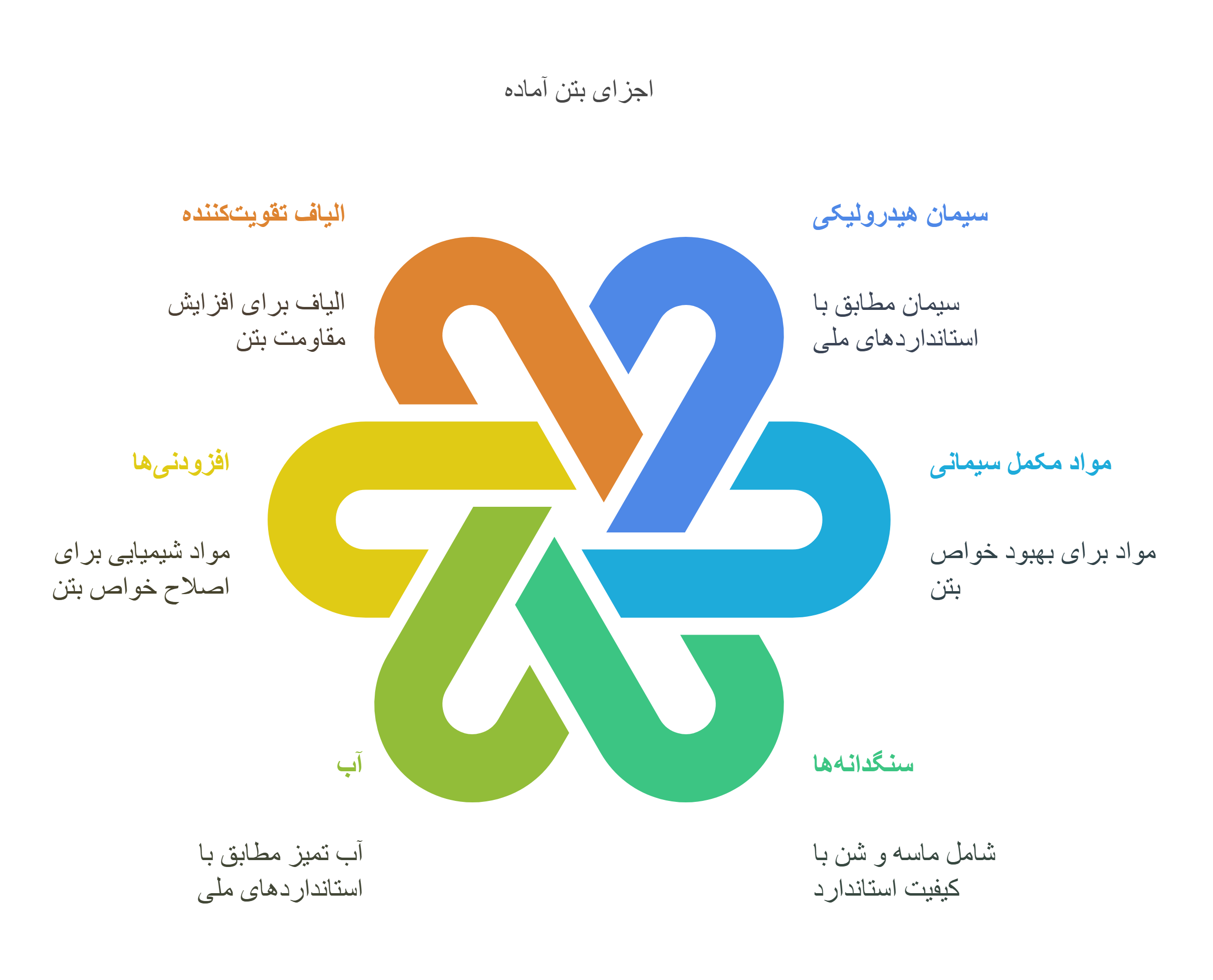 بتن آماده از ترکیب مواد مختلفی تولید میشود که باید همگی با الزامات استاندارد مطابقت داشته باشند. این مواد شامل موارد زیر است: